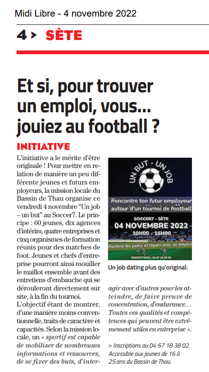 Et si, pour trouver un emploi, vous… jouiez au football ? MLIJ 4 novembre 2022 Presse 0 Partager Tweet Pin it Comments are closed.