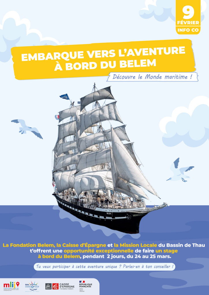 La Fondation Belem, la Caisse d’Épargne et la Mission Locale d’Insertion des Jeunes du Bassin de Thau – MLI t’offrent une opportunité exceptionnelle : un stage de 2 jours à bord du Trois-mâts Belem ! Une expérience unique pour découvrir la vie en équipage et les secrets de la navigation. Les détails de cette aventure incroyable seront dévoilés lors d’une information collective qui aura lieu le vendredi 9 février. Ne manque pas cette chance de faire partie des 7 jeunes de la Mission Locale qui participeront à la traversée Antibes-Sète du 24 au 25 mars. Reste connecté pour en savoir plus sur cette expérience marine inédite !